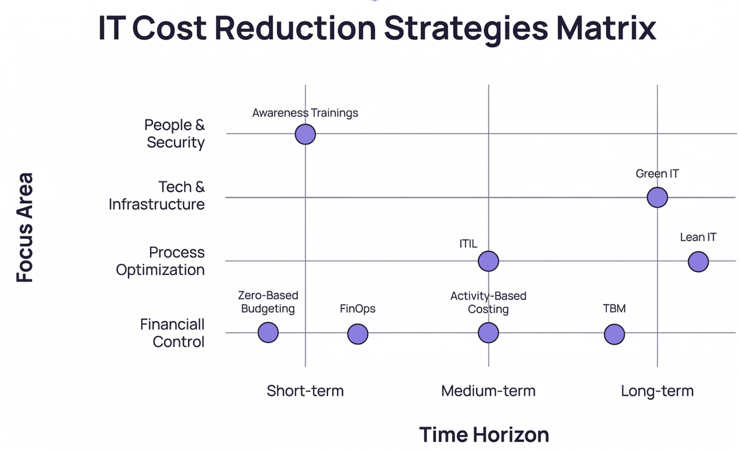 | Long term (12+ months) | Technology Business Management (TBM) | 💰💰💰 | ⚙️⚙️⚙️ | Financial control | Aligns IT spend with business services and strategic priorities. |