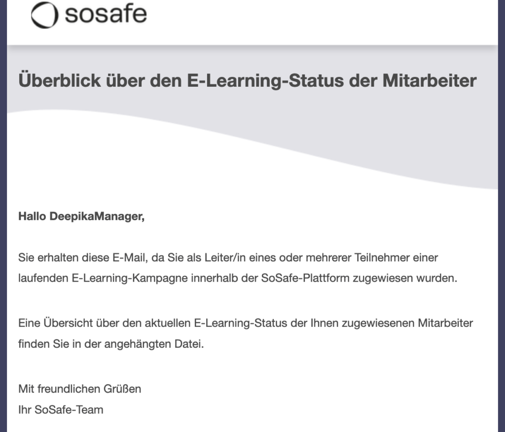 SoSafe Manager Escalation wurde entwickelt, um Ihnen das Tracking und Reporting des Lernfortschritts zu erleichtern. Das Feature sendet automatische E-Mail-Updates mit umfassenden Berichten an Führungskräfte, die in Echtzeit Einblicke in den Lernfortschritt ihres Teams und einzelner Mitarbeitender erhalten. Übersichtliche Daten ermöglichen ihnen, gezielte Maßnahmen zu ergreifen, um Ihre Schulungsmaßnahmen voranzutreiben, Abschlussquoten zu steigern und volle Compliance zu erzielen.