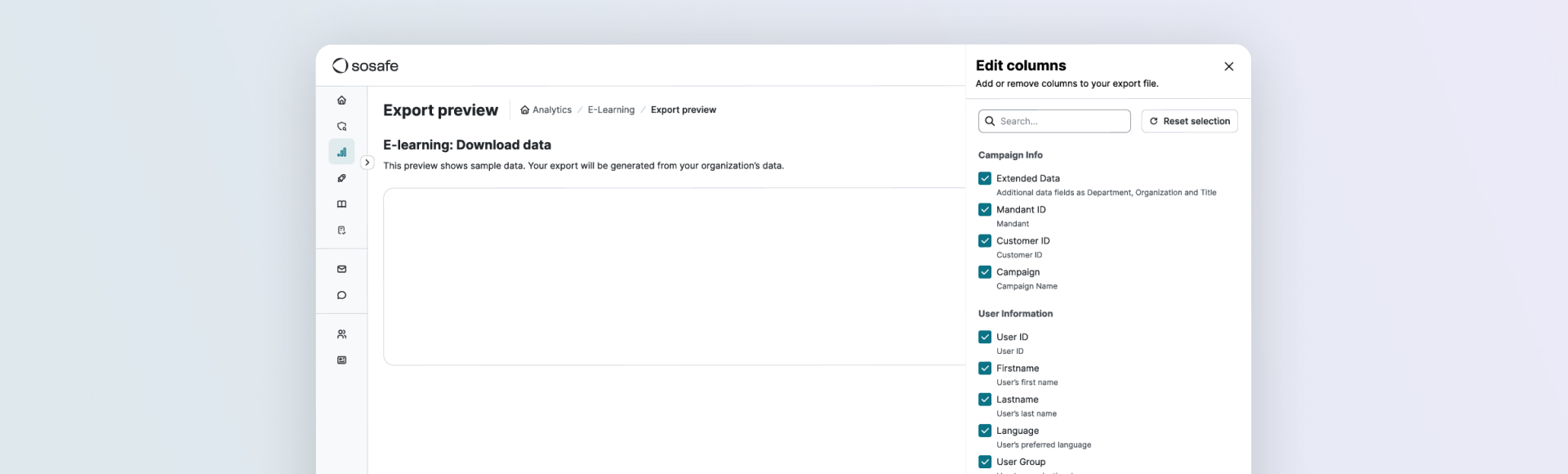 Jetzt wählen Sie genau die Felder aus, die Sie beim Export von E-Learning- oder Simulationsdaten benötigen. Keine unnötigen Spalten löschen oder Dateien manuell aufbereiten. Sie erhalten nur die Daten, die Sie wirklich brauchen.