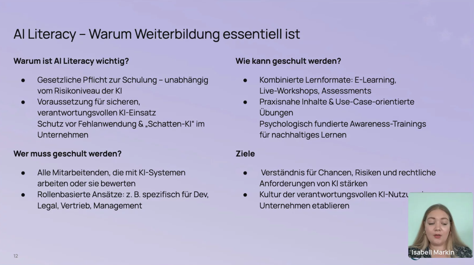 Besonderes Augenmerk liegt auf der Vermittlung von „AI Literacy“: Wer muss geschult werden, wie können Awareness-Trainings wirkungsvoll gestaltet werden und welche Rolle spielt psychologisch fundiertes Lernen?