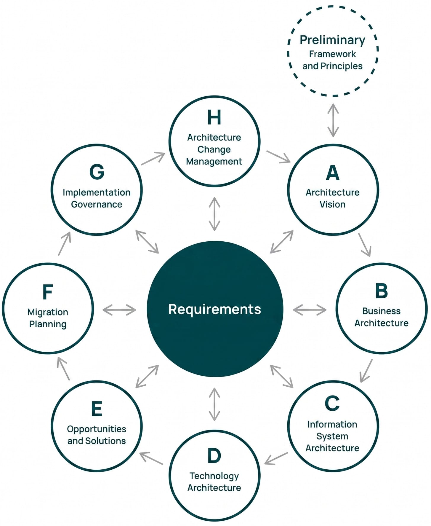 The process starts with a preparatory phase and a central requirements management function that remains active across all stages. From there, the TOGAF framework moves through phases A to H: