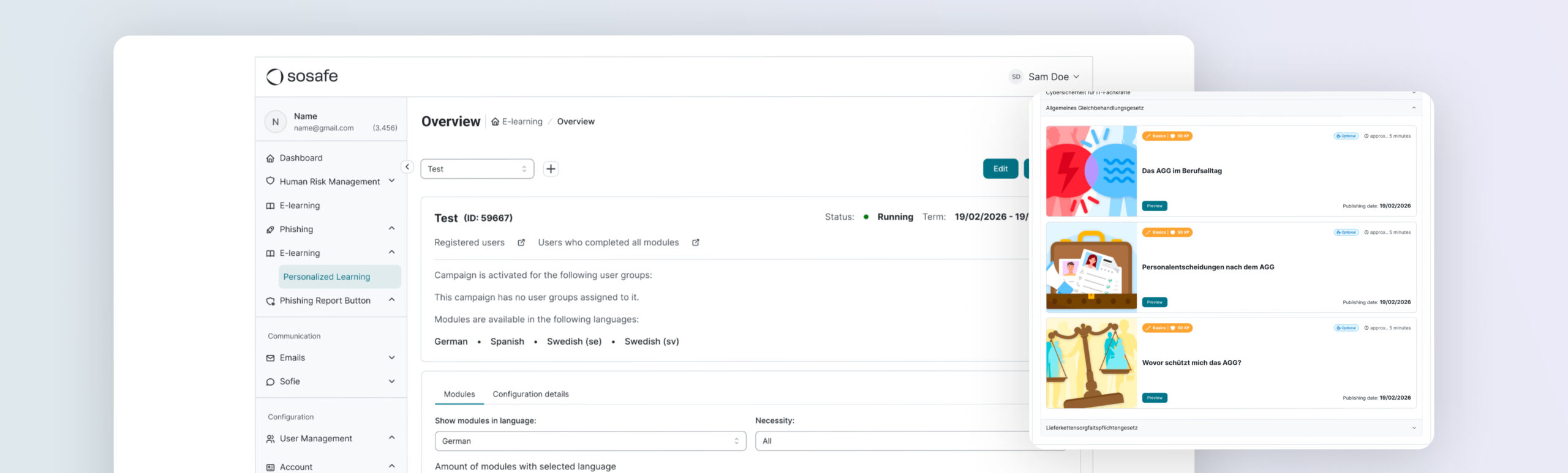 See the full setup of your Personalized Learning campaign in one place, from timing, and user groups to the complete list of modules, including optional and policy-related content.